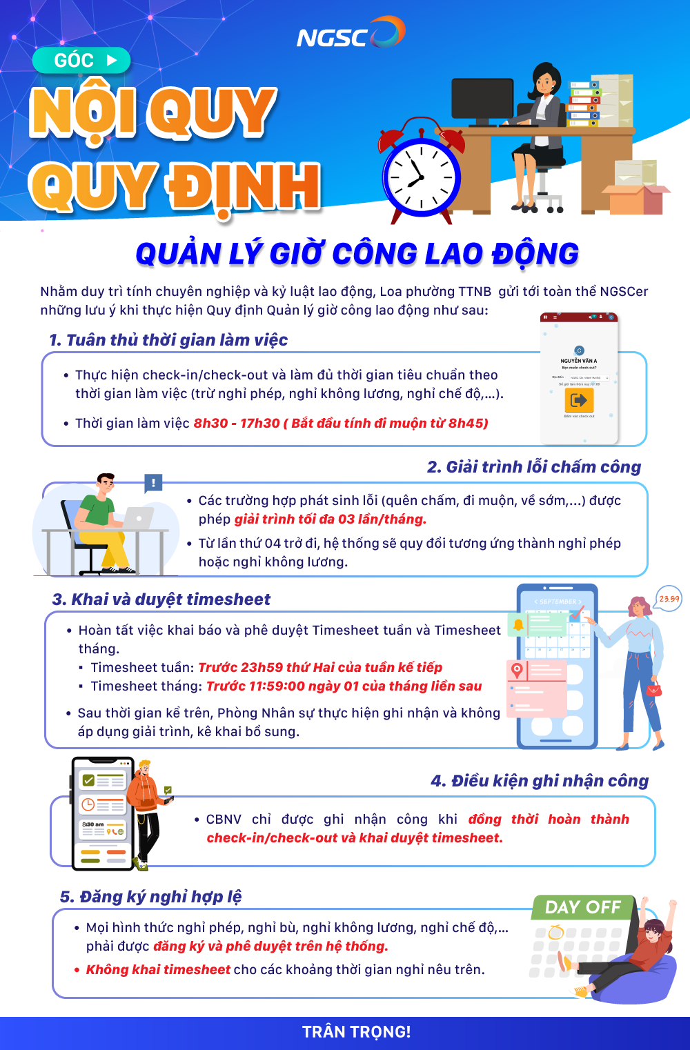 Nhằm duy trì tính chuyên nghiệp và kỷ luật lao động, Loa phường TTNB gửi tới toàn thể CBNV những lưu ý khi thực hiện Quy định Quản lý giờ công lao động.