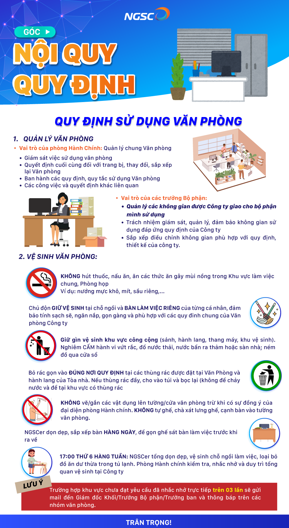 Văn phòng không chỉ là nơi làm việc, mà còn là “ngôi nhà thứ hai” của mỗi NGSCer. Để tạo nên môi trường làm việc chuyên nghiệp, tiện nghi và thân thiện, mỗi chúng ta hãy cùng thực hiện tốt các nguyên tắc sau: