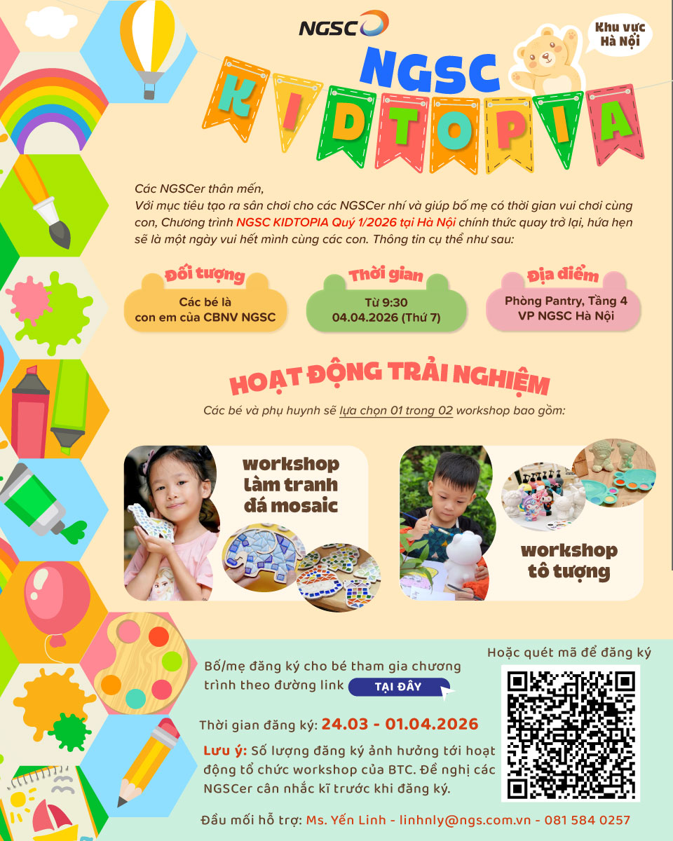 “NGSC KIDTOPIA” đã quay trở lại rồi đây! Với mong muốn đem đến những hoạt động thú vị cho các thiên thần nhỏ nhà NGSC, BTC chương trình xin gửi tới các bố mẹ thông tin chương trình Quý I/2026 như sau: