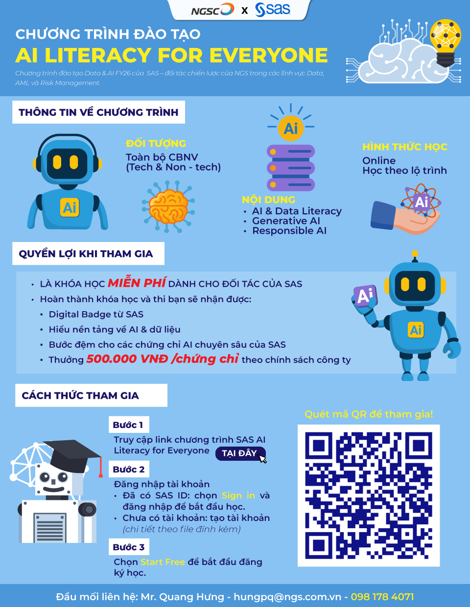 Nếu các NGSCer đang quan tâm và muốn hiểu rõ hơn về AI, Data và Generative AI mà chưa biết chỗ nào Ngon - Bổ - Rẻ. Đừng lo, Loa phường TTNb sẽ lên ngay cho bạn con mã "Khóa học AI Literacy for Everyone" trong chương trình Data & AI FY26 dành cho đối tác của SAS.